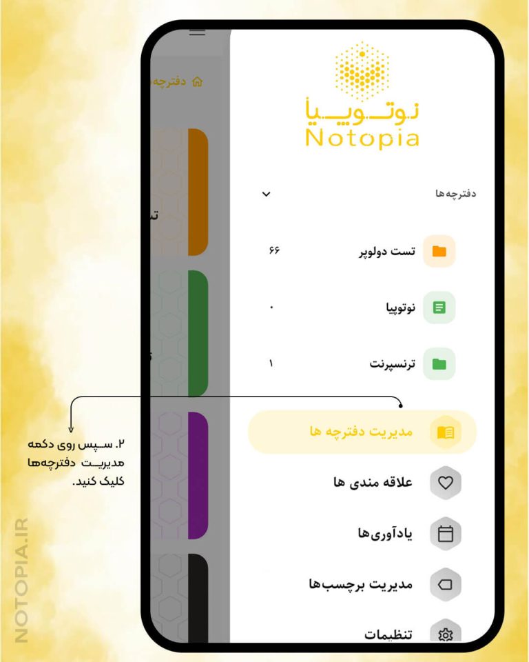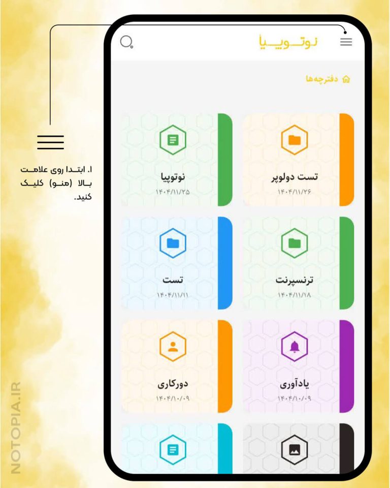 برای مدیریت دفترچهها، از بالای صفحه روی منوی سهخط بزنید.