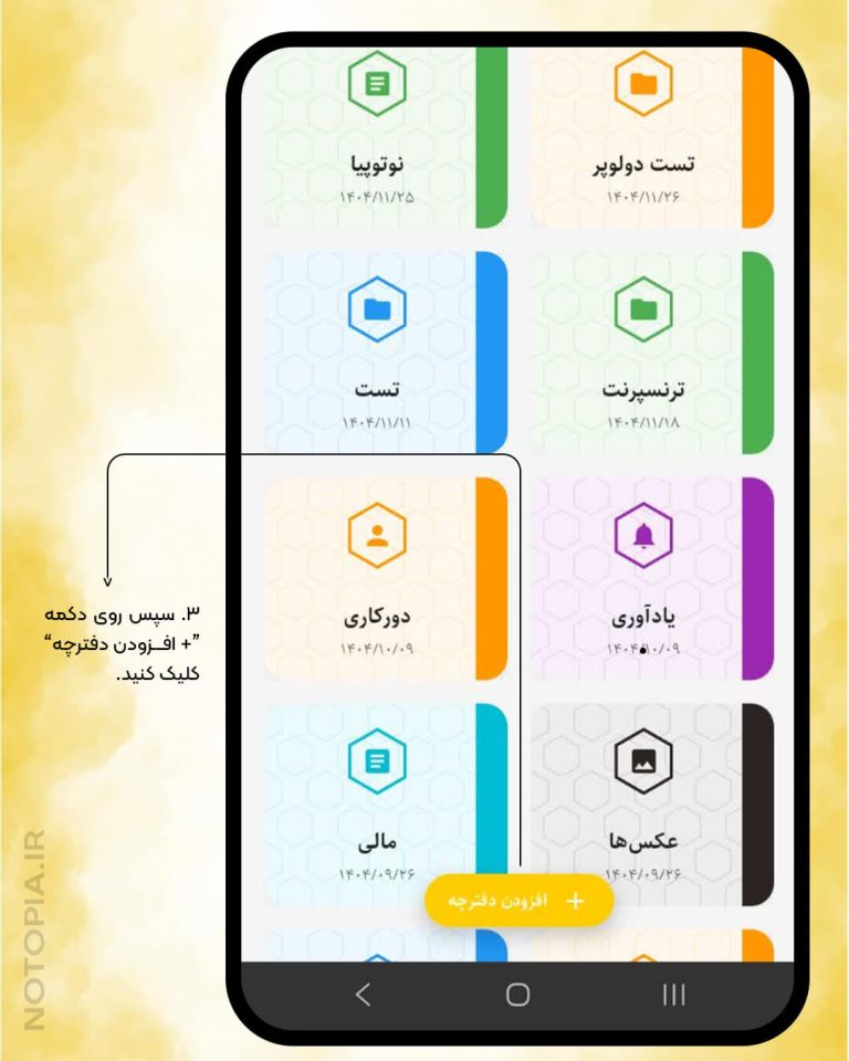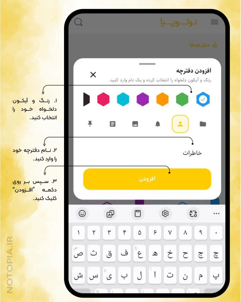 در نوتوپیا میتوانید برای مدیریت بهتر یادداشتها، چندین دفترچه ایجاد کنید. برای ساخت دفترچه جدید، وارد بخش مدیریت دفترچهها شوید و گزینه «افزودن دفترچه» را انتخاب کنید. نام دلخواه خود را برای دفترچه وارد کرده و در صورت نیاز توضیح کوتاهی اضافه کنید. میتوانید رنگ و آیکون اختصاصی برای هر دفترچه تعیین کنید تا سریعتر قابل تشخیص باشد. نوتوپیا امکان ایجاد چند دفترچه همزمان را فراهم میکند و هیچ محدودیتی در تعداد وجود ندارد.