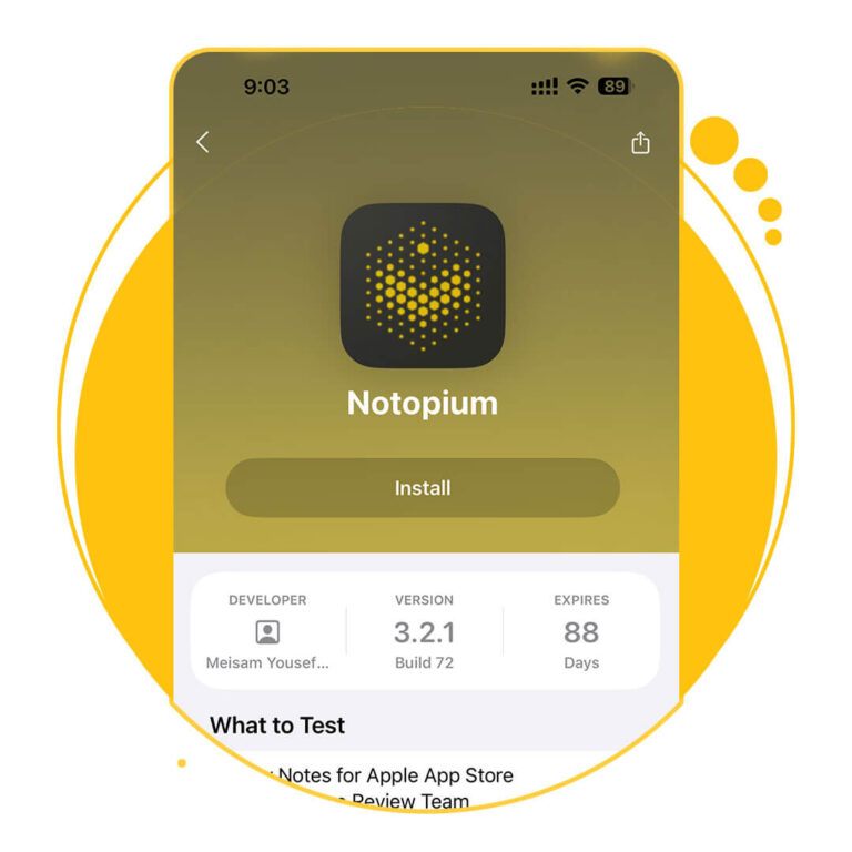 با زدن روی دکمه پایین، شما به اپلیکیشن TestFlight و صفحه دانلود اپلیکیشن نوتوپیا وارد میشوید. دکمه Install را زده و برنامه را دانلود کنید و از آن استفاده کنید.